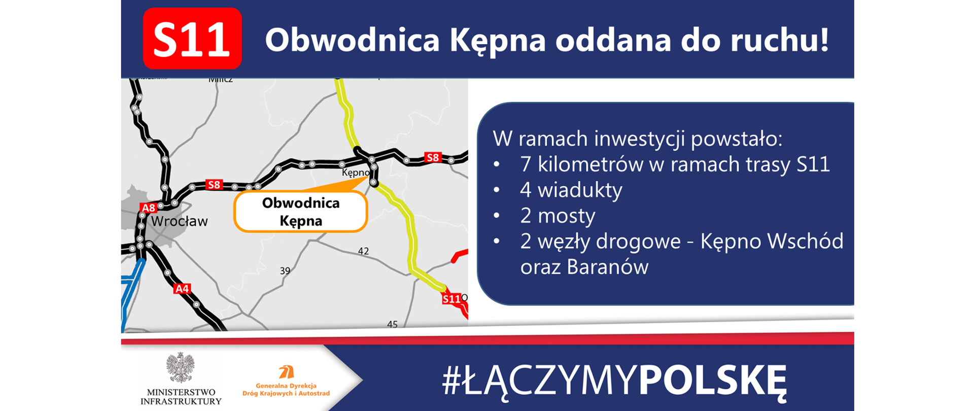 Realizacja obwodnicy Kępna w ciągu drogi ekspresowej S11 została podzielona na dwa odcinki północny i południowy. Projektowana łączna długość drogi wynosi 550 km. GDDKiA planuje że jeszcze w drugiej połowie sierpnia możliwe będzie udostępnienie nowego odcinka drogi kierowcom.